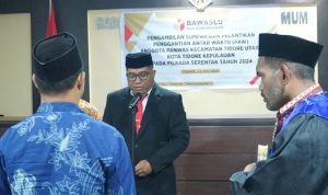 “PAW ini dilakukan berdasarkan urutan peringkat dari hasil seleksi yang dilakukan Bawaslu Kota Tidore Kepulauan pada seleksi Panwascam untuk Pilkada 2024 lalu. Tak hentinya saya terus mengingatkan agar tetap menjaga integritas, Independen, bertanggungjawab dan bekerja sungguh-sungguh dalam menjalankan tugas pengawasan pada Pemilihan Tahun 2024,” tuturnya.