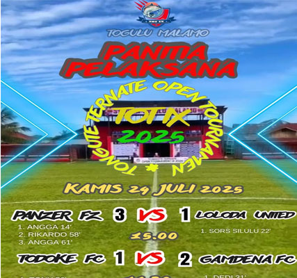 Jazirah Indonesia– Hari ke 5 Tongute Ternate Open Tournament (TOT IX) pada laga perdana babak penyisihan grup H dan I berlangsung Kamis, (24/07/2025), team Panzer FC dan Gamdena FC meraih kemenangan sempurna.