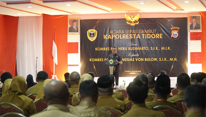 Hal tersebut disampaikan Wali Kota pada acara lepas sambut Kapolresta Tidore Kepulauan dari Kombes Pol. Heru Budiharto kepada Kombes Pol. Ampi Mesias Von Bulow yang berlangsung di Aula Sultan Nuku, Kantor Wali Kota Tidore Kepulauan, Selasa (6/1/2026).